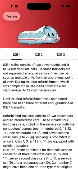 tabs: Array of tab items conforming toDBTabselection: Binding to the currently selected tabheaderOpacity: Optional binding to track header visibilityheader: ViewBuilder for the scrollable header contentbackground: ViewBuilder for the backgroundtabLabelProvider: Closure that provides the view for each tab labelpages: ViewBuilder containing the page views (this must match the count of items in thetabsarray!)